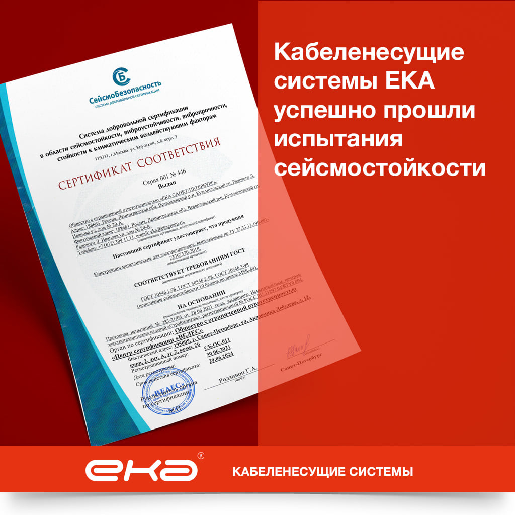 Кабеленесущие системы ЕКА успешно прошли испытания на соответствие требованиям ГОСТ 30546.1-98, ГОСТ 30546.2-98, ГОСТ 30546.3-98 (исполнения сейсмостойкости 10 баллов по шкале MSK-64), о чем был выдан сертификат.